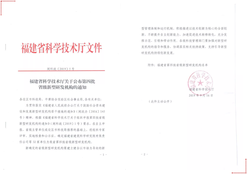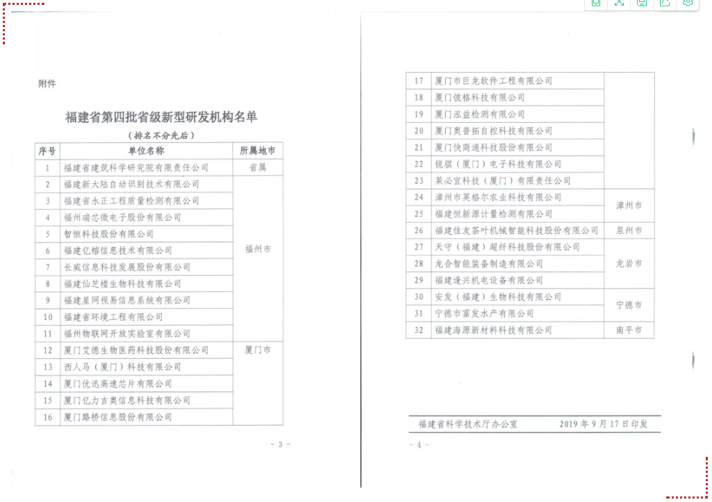 日前,福建省科學(xué)技術(shù)廳公布了第四批省級新型研發(fā)機構的名單,此批名單全省共有32家,我司成功入選。